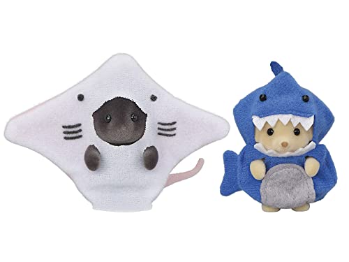 *サメのコスチュームを着たラブラドールの赤ちゃん ポピー、エイのコスチュームを着たモグラの赤ちゃん ムーのペアセットです。