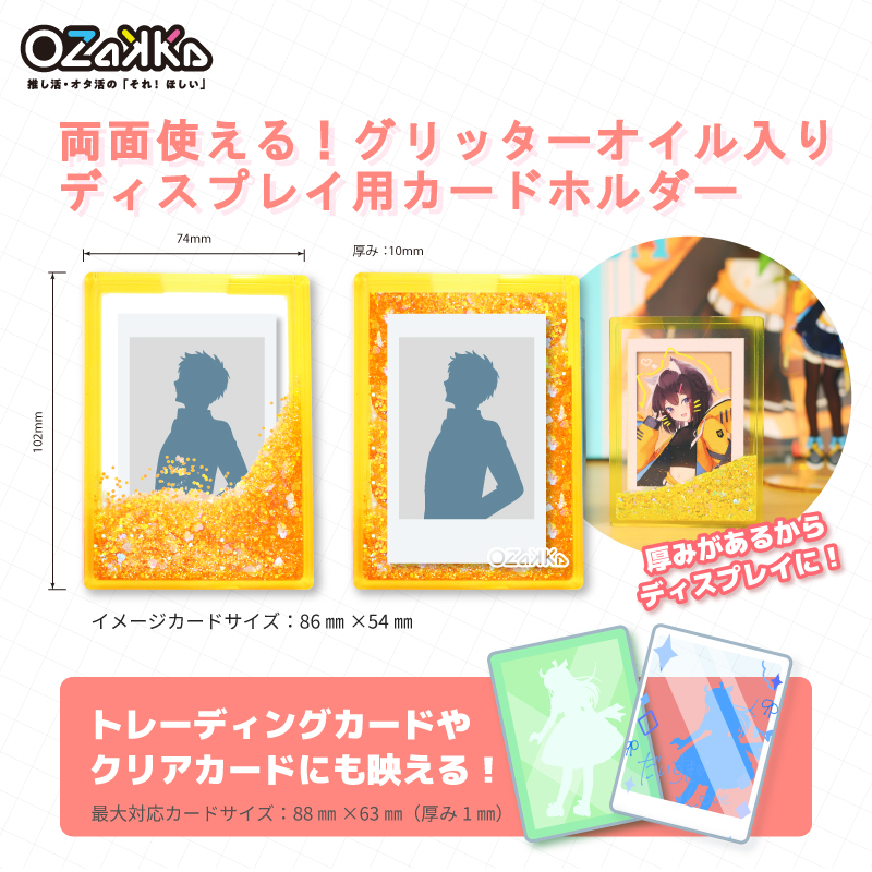 グリッターフォトブロック【AGF2025限定】 推し活 アニメイトオンライン グリッターフォトブロック オレンジ【AGF2025限定】 グリッターフォトブロック イエロー【AGF2025限定】 製品情報 とっておきのカードがキラキラ仕様に大変身! 両面使える! グリッターオイル入りディスプレイ用カードホルダーです。 【サイズ】本体:約(幅)74×(高さ)102×(厚さ)10mm 【素材】アクリル、オイル 【重さ】約74g