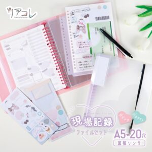 ●セット内容:A5サイズ対応 20穴バインダーファイル1冊、挟める下敷き1枚、メモシールブック1冊(2柄各10枚)、スライダーポーチ1枚、高透明リフィール3枚(3種各1枚)、現場レポルーズリーフ10枚(2柄各5枚)